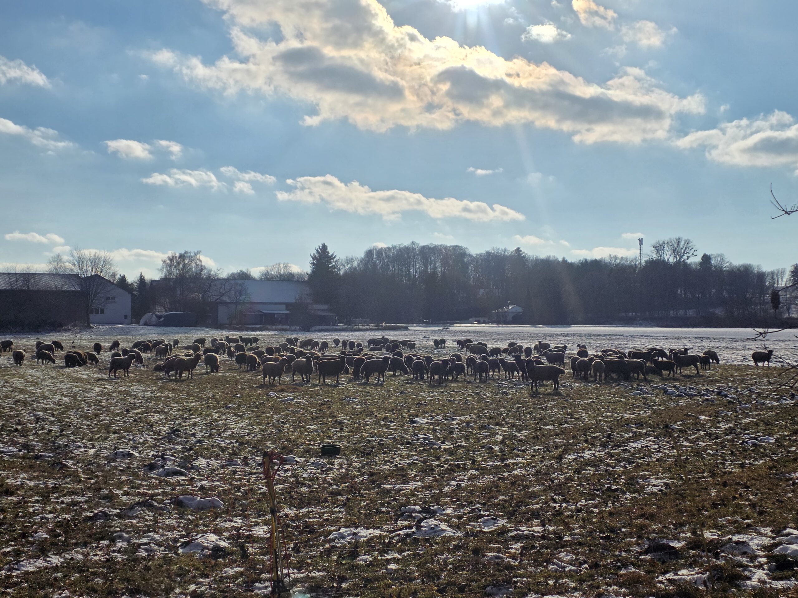 Schafe im dicken Winterfell fressen das kurze Gras in der Januarsonne