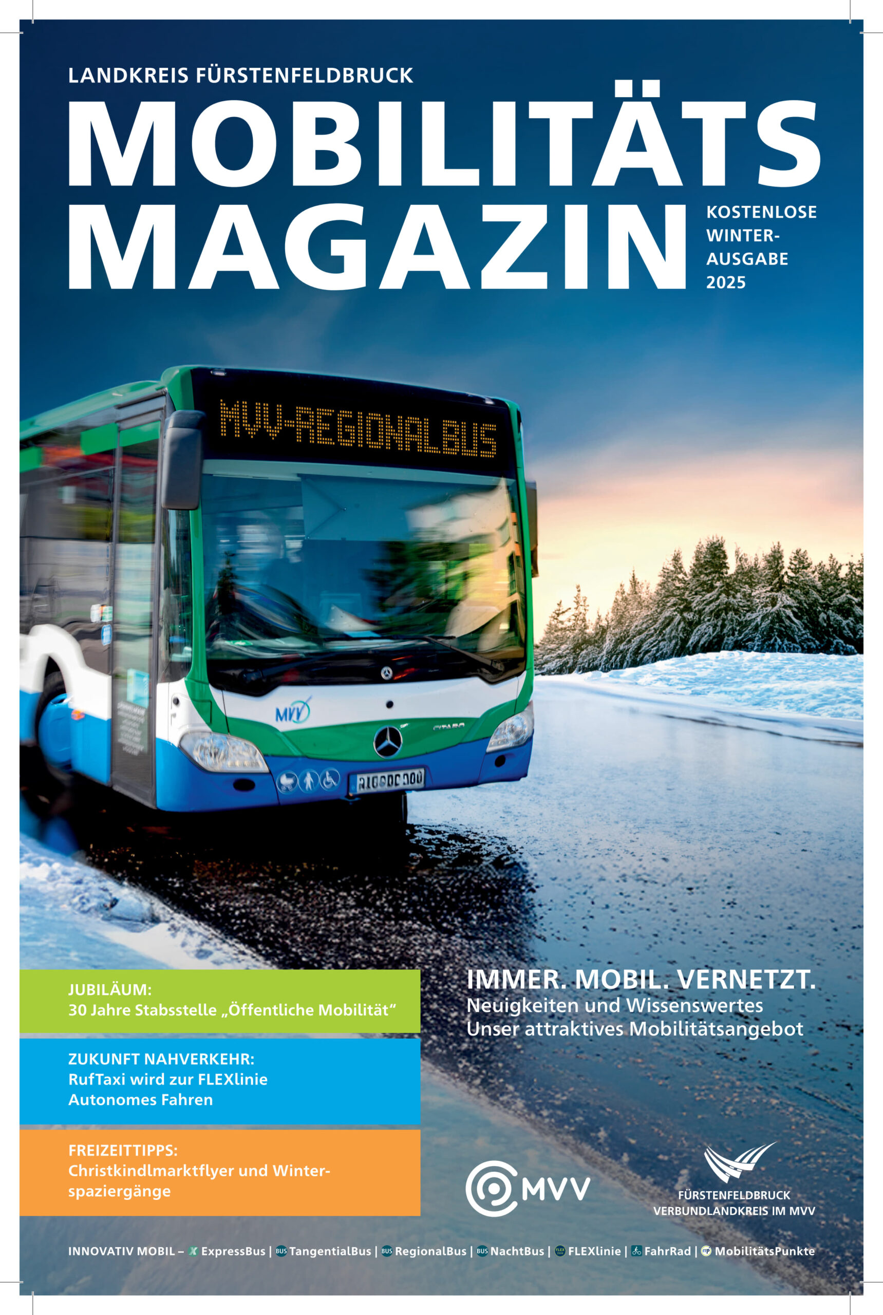„Immer. Mobil. Vernetzt.“ Auch zum Jahresende klärt die Winterausgabe des „Mobilitäts-Magazins“ für den Landkreis Fürstenfeldbruck anschaulich und informativ auf 24 Seiten über alle Neuerungen und Änderungen auf.