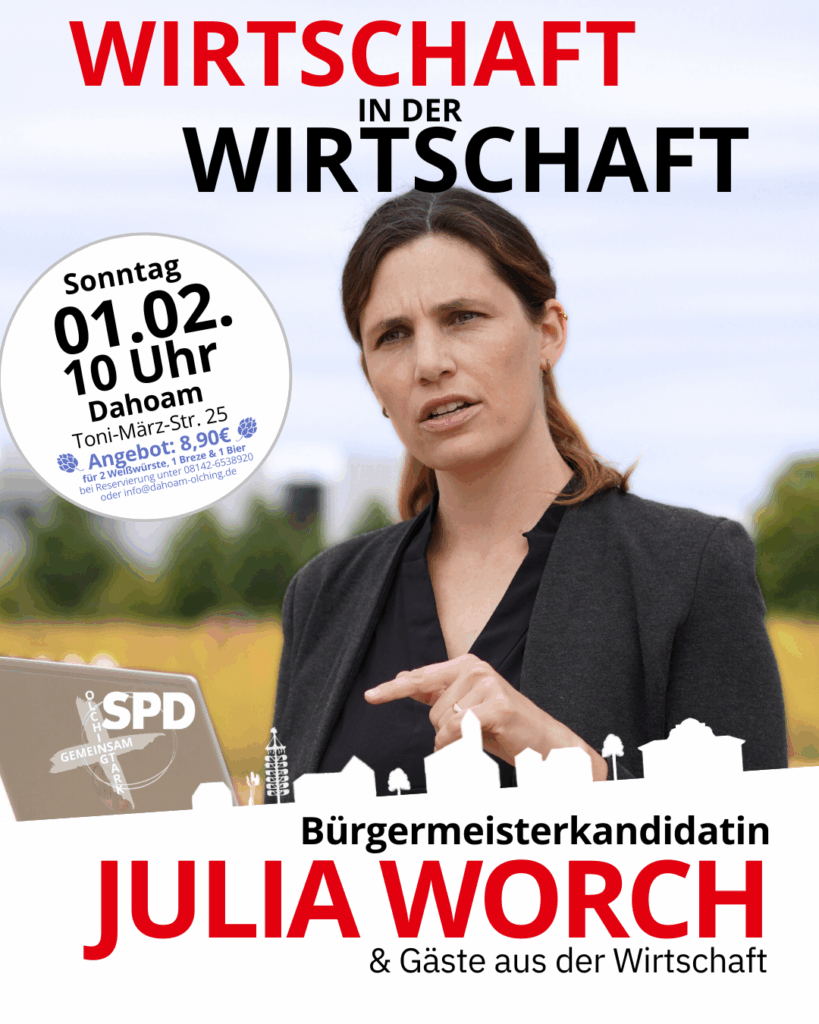 Am Sonntag, den 01.02. veranstaltet die SPD Olching mit Bürgermeisterkandidatin Julia Worch einen wirtschaftspolitischen Frühschoppen, von 10-12 Uhr im Dahoam in Olching.