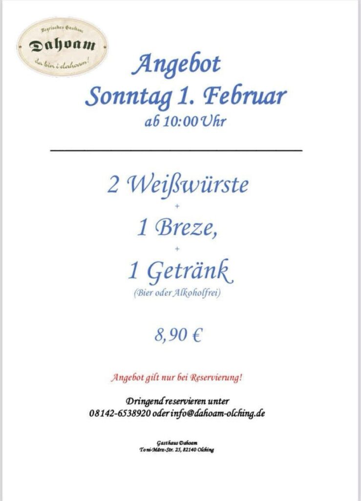 🍻Und das zum kleinen Preis: Bei Reservierung vorab im Dahoam gibt es 2 Weisswürste, Breze und Bier für 8,90€.